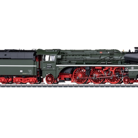 Locomotora de vapor Southern Pacific “Berkshire” con disposición de ruedas 2-8-4. Color negro intenso. Número de serie 3505. La locomotora presenta el mismo aspecto que entre 1945 y 1950. Una de las 25 locomotoras construidas con el llamativo calentador de agua de alimentación Coffin.